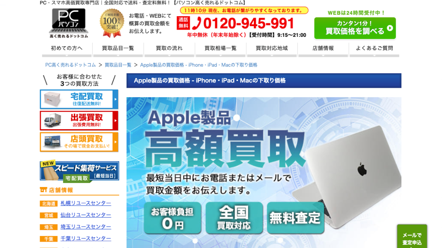 パソコン高く売れるドットコムは、その名の通り、パソコンやその他のApple製品が高く売れる買取業者です。買取サービスも、宅配買取、出張買取、店舗買取の3種類から選べます。