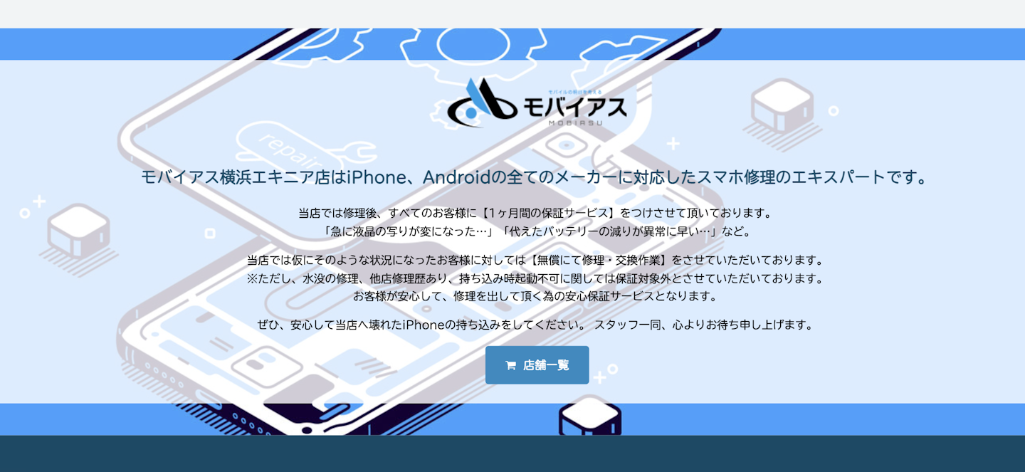 モバイアス 横浜エキニア店は、iPhoneの「買取」だけでなく「修理」にも対応しており、中でも「低価格な修理サービスの提供」「丁寧親切なお客様対応」「修理サービスにプラスαの価値」を提供する事をグループ全体でモットーにしています。