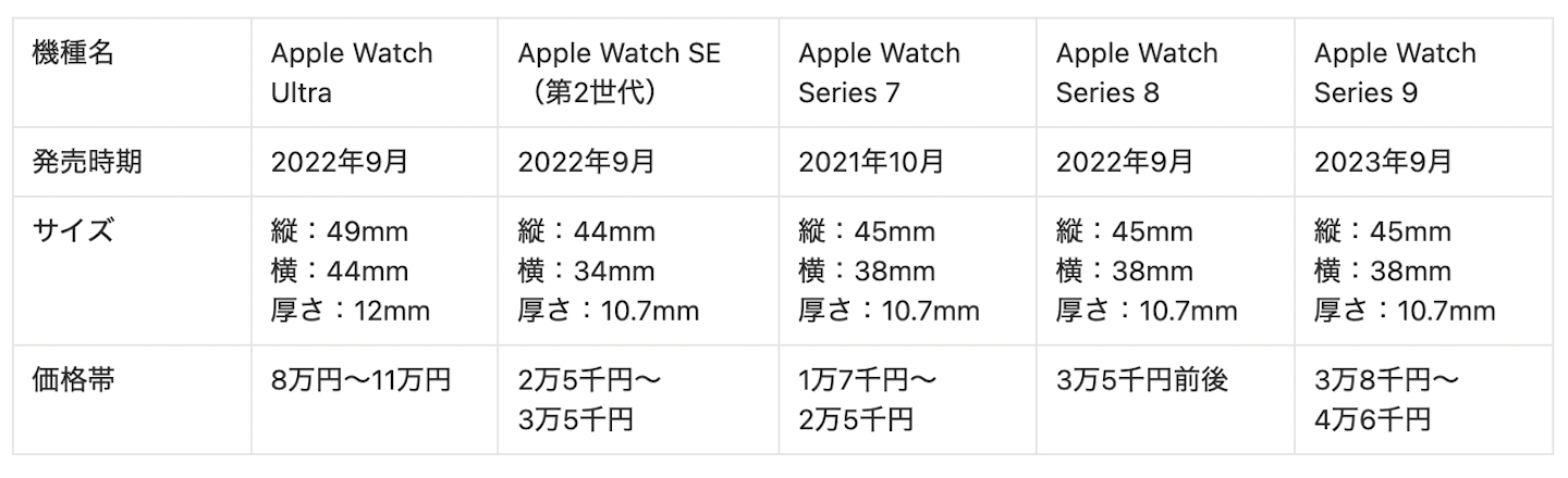 Apple Watchの中古品は、次に紹介する5つの機種の中から選ぶのがおすすめです。さらに、下記には比較表も追加しましたので、確認してみてください。