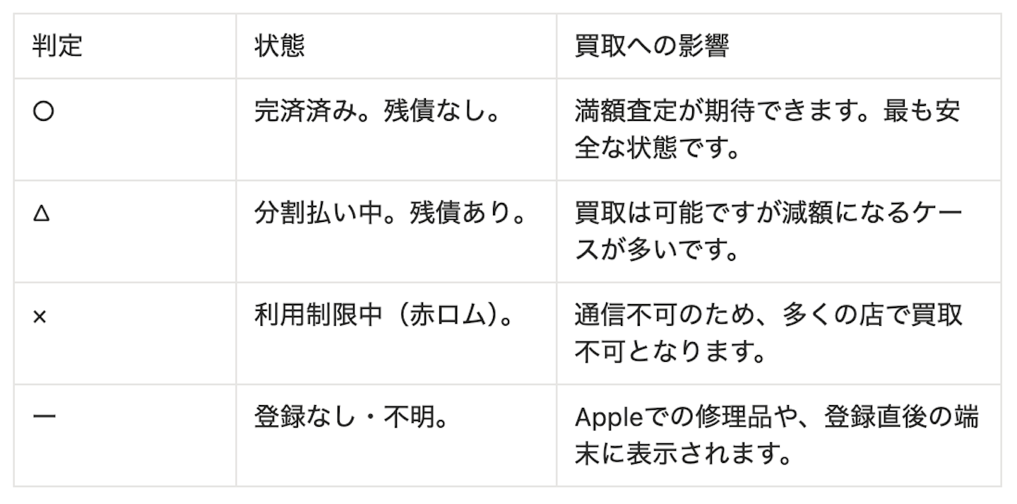 結論から言えば、「△」の端末も買取可能です。ただし、売却後も元の持ち主が支払いを継続する義務があります。もし途中で支払いが滞ると、次にそのiPhoneを使う人が通信できなくなってしまう(×判定になる)リスクがあるため、多くの買取店ではそのリスク分として数千円程度の減額査定を行います。