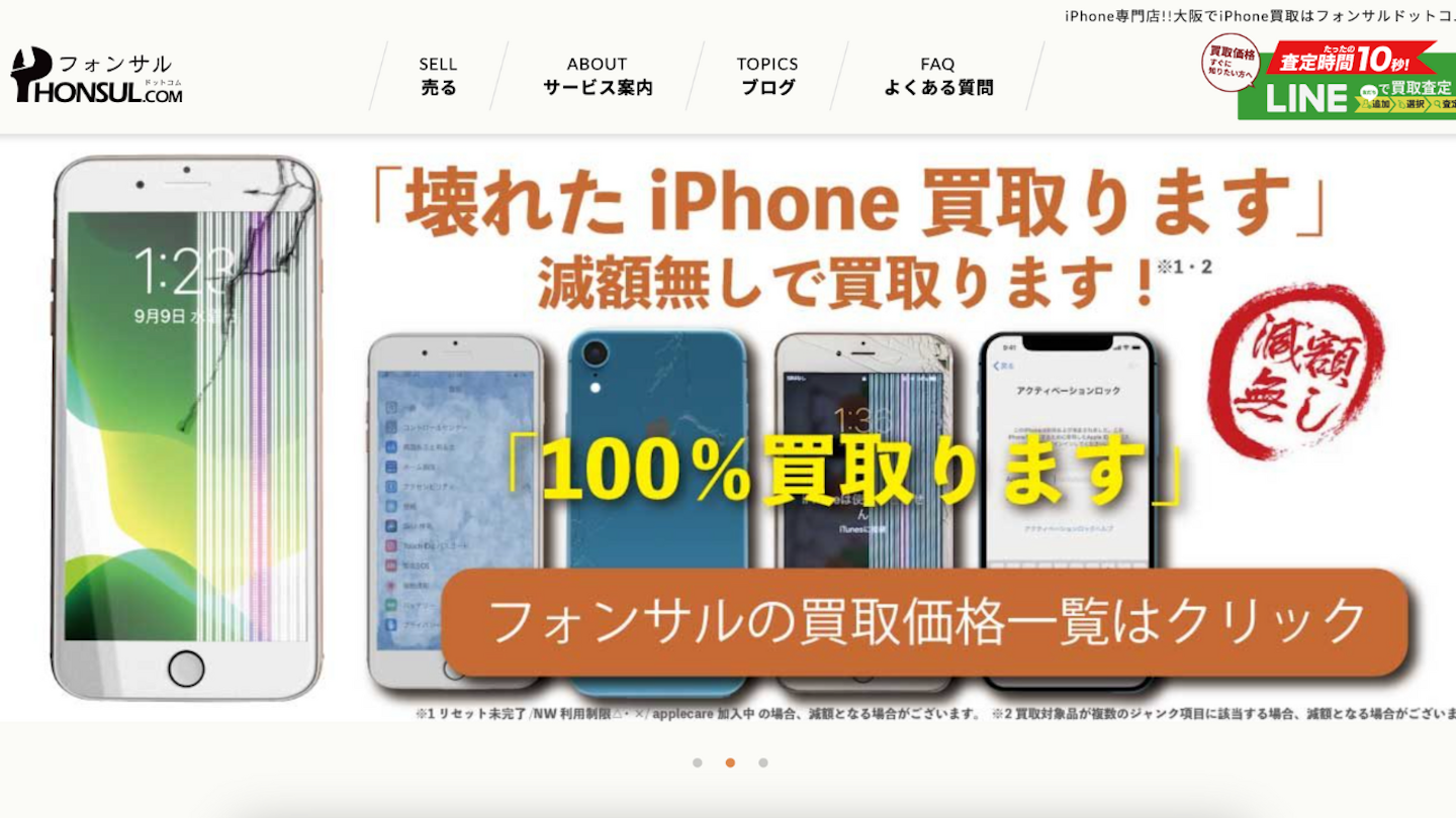 大阪の日本橋に実店舗を構える「iPhone買取フォンサルドットコム」は、壊れたiPhoneでも100%買取をしているほど、ジャンク品のiPhone買取に力を入れています。