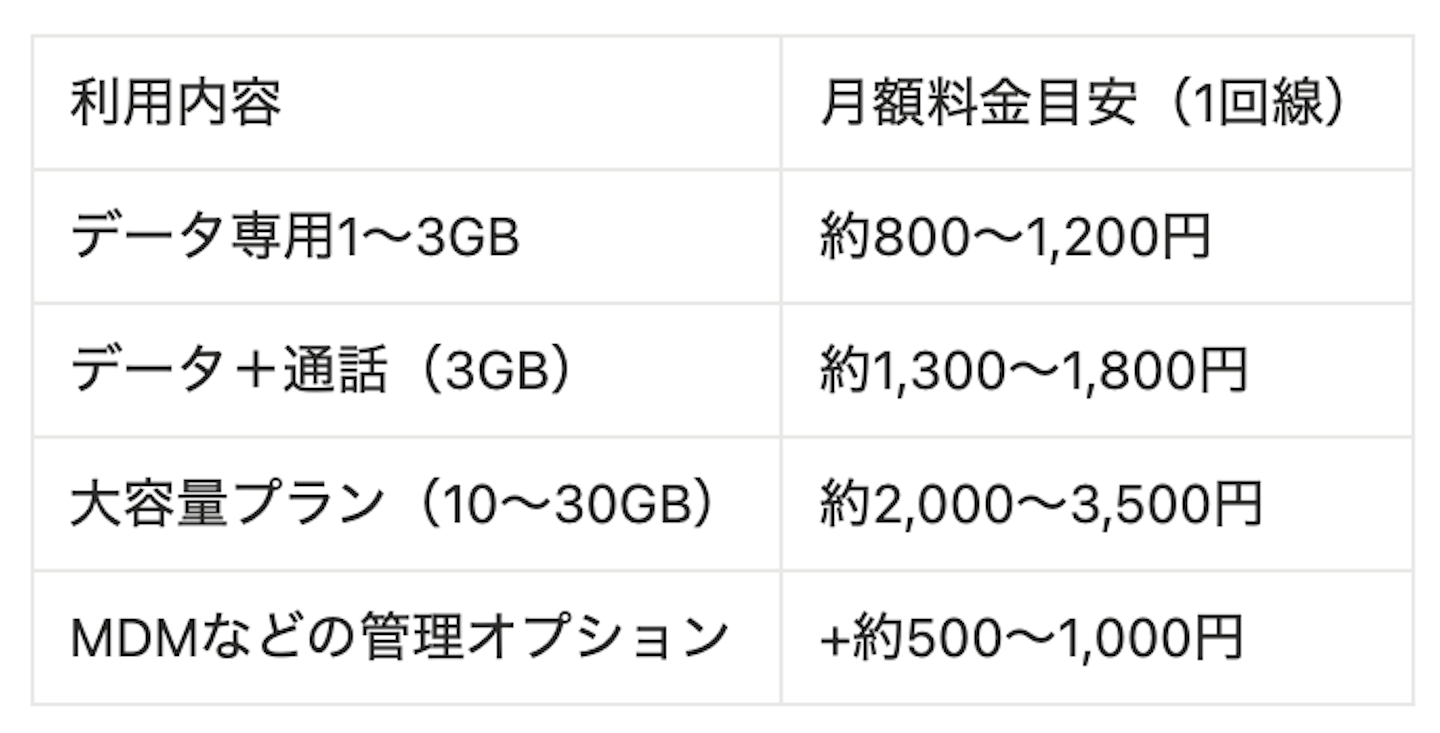 格安SIMを法人で契約した場合の月額料金の価格相場は、以下のようになっています。