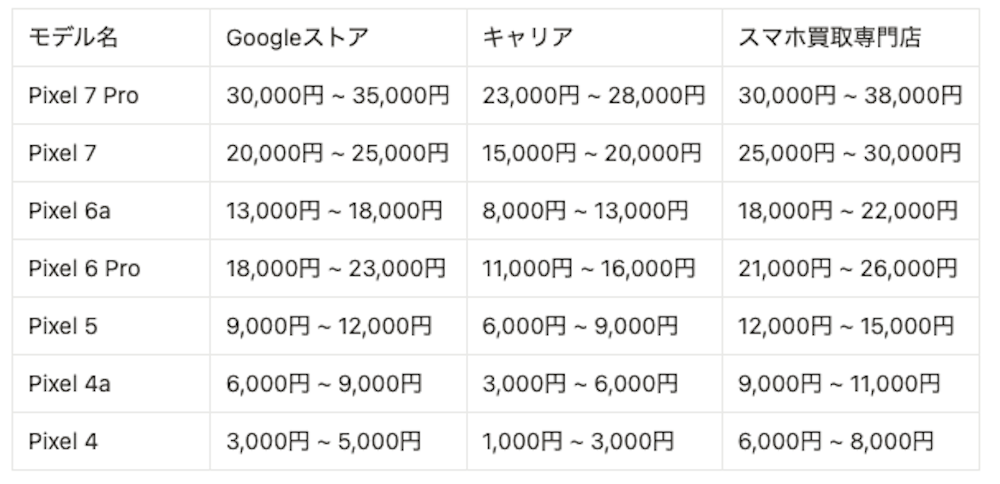 以下の表は、2025年4月時点でのGoogle Pixelシリーズ主要モデルの下取り価格相場です。
