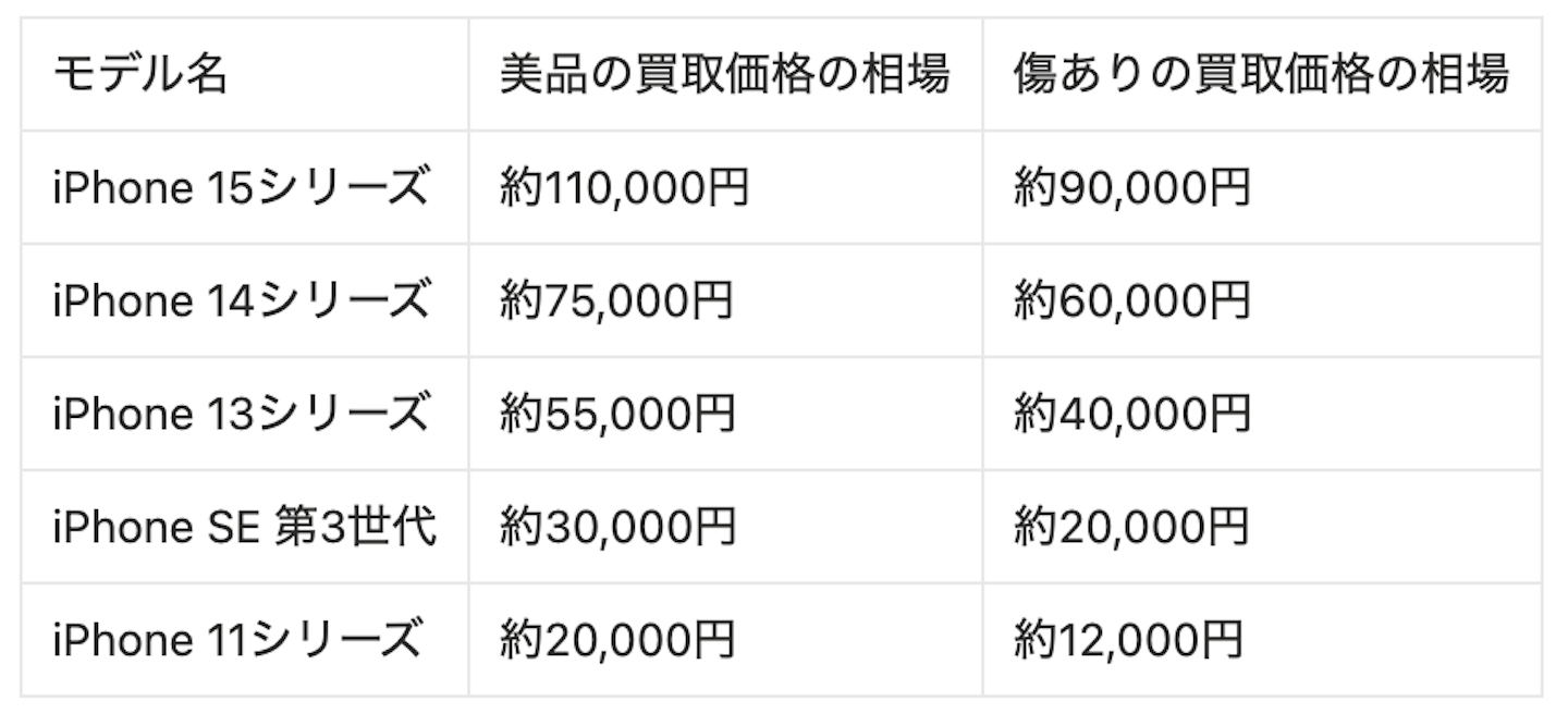 主要なiPhoneモデルの一般的な買取価格の相場は、以下の表を参考にしてください。